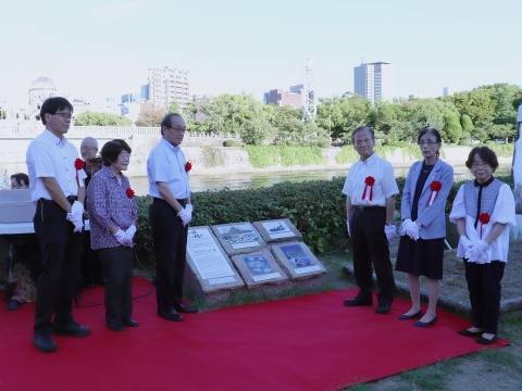 On July 22, a new ceramic board “A-bomb Memorial Painting Monument” was unveiled at the west end of Aioi Bridge in Naka-ku, Hiroshima City, where the Atomic Bomb Dome is visible across the river.