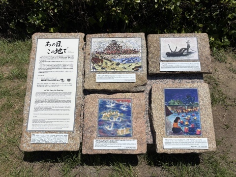 The monument combines four ceramic-fired paintings with an explanatory panel titled “At This Place, On That Day” accompanied by the message: “Please look at these paintings so that this scene is never repeated on Earth.”