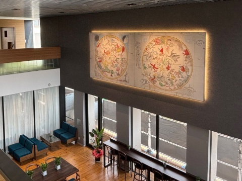 At the Omiya Campus, a ceramic board featuring an approximately 4.8 times enlarged version of the “Celestial Globe Diagram” (a constellation map painted by Edo-period artist Shiba Kohan) is displayed in the Reimeikan building. Additionally, a ceramic board displaying a photograph of the Third Buddhist Middle School Main Building (built in 1909), enlarged approximately 16 times, is installed in the café of the affiliated Heian Junior and Senior High School.