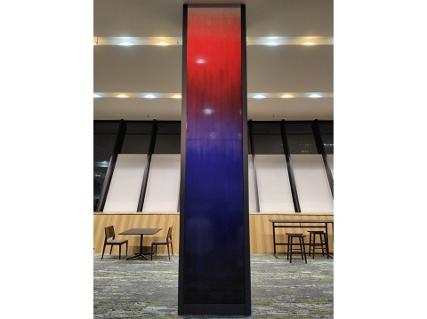 The ceramic board pillars are based on designs from the fourth-generation master's representative Kutani ware works: “Mizuho” (Abundant Rice) and “Shōjō” (Shojo). “Mizuho” depicts golden rice ears bowing under their heavy harvest. “Shōjō” refers to the ancient color ‘shōjōhi’ (shojo red) and is named after the Noh play “Shojo,” performed by actors wearing red costumes. Two ceramic board pillars, each 3 meters tall and 80 centimeters wide, based on the “Mizuho” design, were installed in the foyer of Urecious Komatsu. One pillar, 5 meters tall and 90 centimeters wide, based on the “Shōjō” design, was installed in the Komatsu Hokuden Hall.