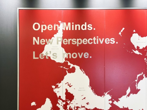 逆さ世界地図をモチーフにした“発想の転換”を促すデザインで、「Open Minds.(新しい考えを受け入れよう)」「New Perspective.(新しい視点を持とう)」「Let’s Move.(さあ、始めよう)」といったメッセージが焼き付けられています。