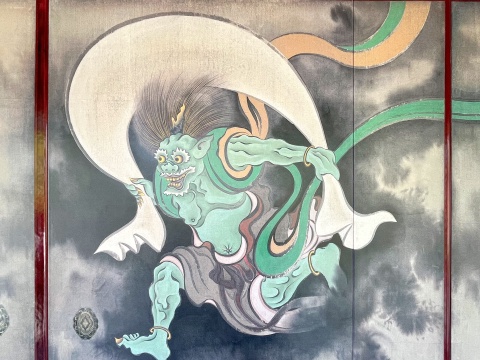 鈴木其一作「風神雷神図襖」は同館の代表的な収蔵作品ですが、保存上の理由から公開期間が限られ、常時一般公開することが難しいことから、来館者がいつでも鑑賞できるよう今回新たに複製陶板が製作されました。原作は絹本の襖絵で、もともとは風神図4面と雷神図4面が表裏になる形で仕立てられていましたが、現在は各面をしつらえ直し、8面として保管されています。製作にあたり、絹本部分の表現だけでなく、引手の立体感など細部にまでこだわり忠実に再現しました。
