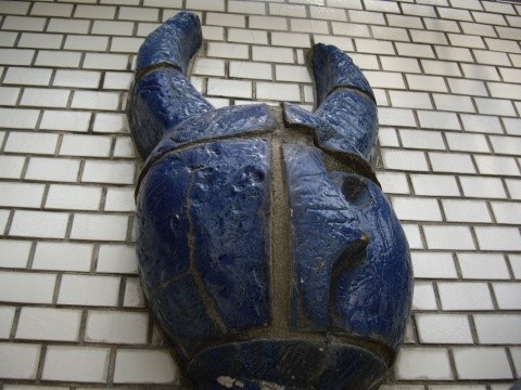 ▶ 旧レリーフ:行動美術協会彫刻部 協同制作 材質:陶板(信楽焼) 1958年作 当時の行動美術協会会員である建畠覚造・向井良吉・今村輝久・野崎一良・松岡阜らの手による。焼き物の里、信楽で合宿し、共同制作された。