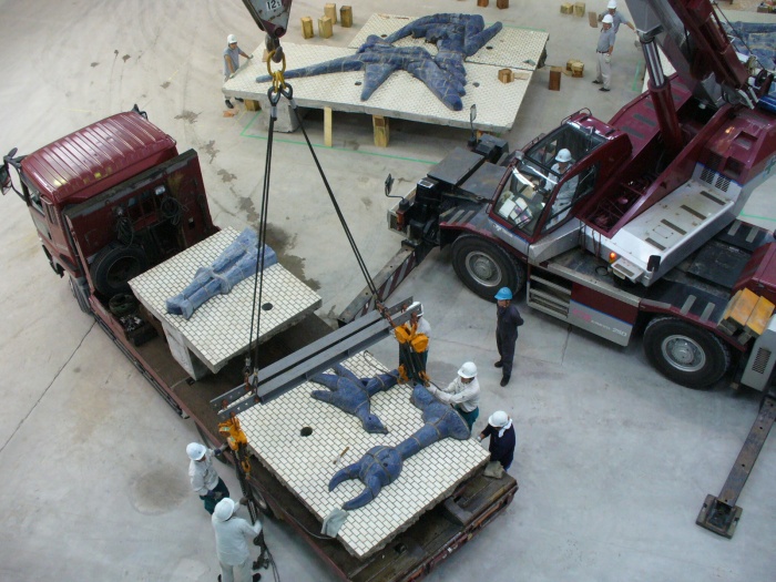 滋賀県にある当社信楽工場に運び込まれる旧レリーフ