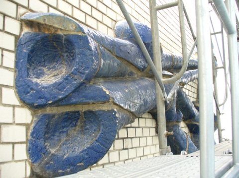 ビルの老築化に伴う建替が決まったあと、新しいビルでのレリーフ検討のため、私たちは現地調査をさせて頂くことになりました。足場に登り間近で触れて見たそれは、下からの眺め以上の迫力でした。牧神は縦横約4~6m、一番小さな月でも2mにおよぶ大きさ。そして、1ピースが縦約30㎝×横約45㎝の大きな焼き物で、約350ピースに分けたものが組み合わせて作られていました。 物資も少ない時代に、これだけ大きなアートワークを設置することを考え、なおかつ若手作家たちに制作をゆだねることを決断した事業主の想い。そのチャンスをものにした当時の若者たちの喜びと意気込みが、このレリーフの勢いを作ったのでしょう。荒々しくも生命感のあるそれは、半世紀に渡ってエネルギーに満ちた存在感を放っていました。