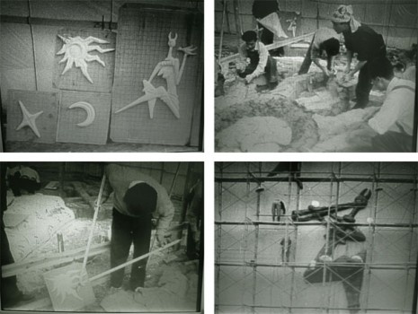 旧レリーフ制作風景(資料提供:竹中工務店「記録映画:新朝日ビル誕生」)