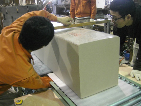 しかし、30㎝もの厚みがあるブロックを均質に、安定的につくるには、原料選定から押出しの方法まで様々な検証が必要でした。何度もチャレンジすることになりましたが、設備変更の末、安定したブロックを作ることができるようになりました。