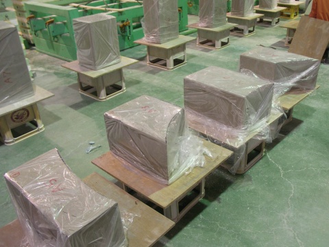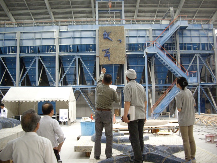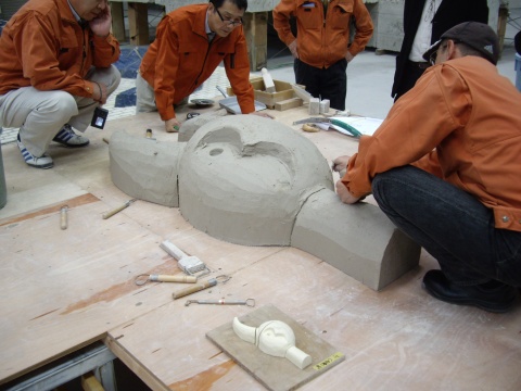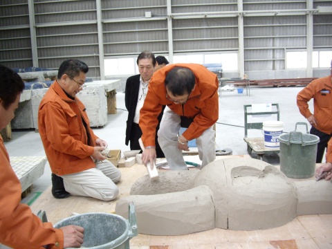 新レリーフは、旧レリーフとほぼ同じ大きさのピースを用いて構成することになりました。その大きさは、最大1ピースが縦30㎝×横45㎝×厚み30㎝。これを約350ピース作らなければなりません。まず、レリーフ用に調合された土を成型機(土を抜く機械)で抜き、土のブロックを作っていくのですが、30㎝の厚みのブロックは未知の経験でした。