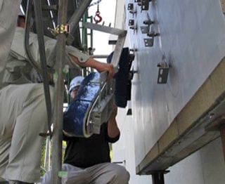 レリーフは土佐堀川に面した南壁面の、高速道路上からも見えるような高い位置に設置されることが決まっていました。しかし、このような高所に巨大なレリーフを設置することは、私たちにとって初めての経験です。
