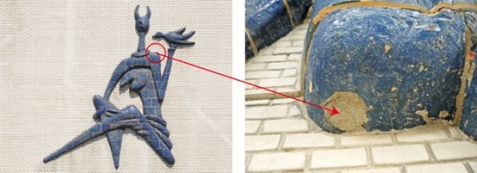 ▶旧レリーフは、モルタルを充填させながら1ピースずつ積み上げ、取り付けられた。肩部分上部のピースには、モルタルの充填跡がある。