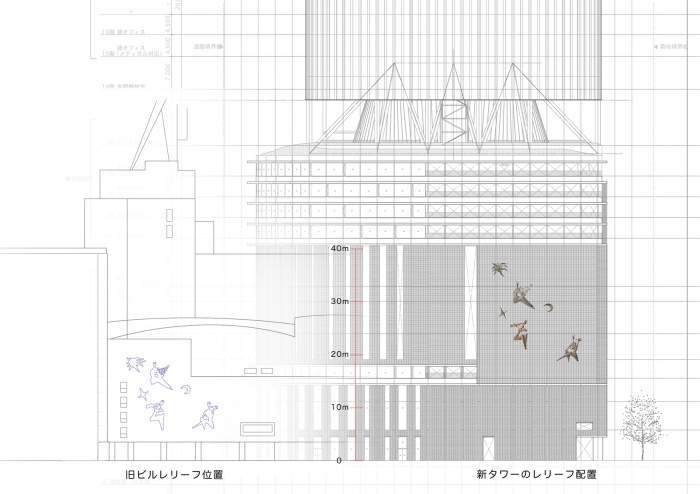 ▶ビル全体の形状も考慮した上、旧レリーフの配置よりも「太陽」を高く、「牧神(鳥)」を低く配置し、バランスをとった。新レリーフは、旧レリーフよりも高い位置に設置される。