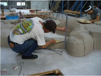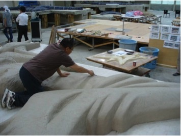 ▶1/5マケットで測定した各ピースの高さを元に土ブロックの粗彫りを行う。監修者が手を入れるため、削りすぎないようにする。