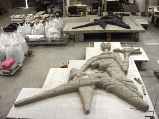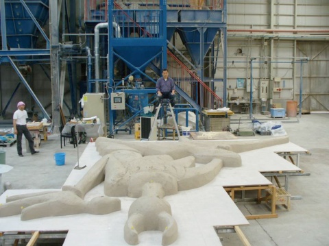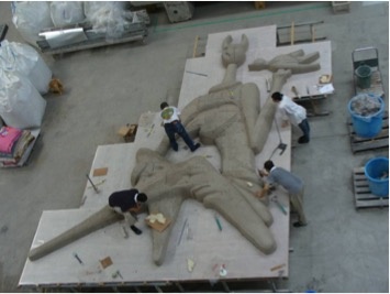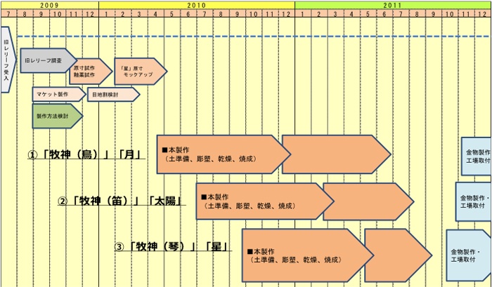 「星」の原寸大試作によるモックアップが終了し、製作方法と工法が決定しました。並行して陶土の調合が進められ、本製作が始まりました。レリーフは巨大であり、6体同時に進めると、本体陶土の彫塑に支障をきたすと判断したため、レリーフ6体をそれぞれ2体ずつ春から秋にかけて三期に分け、製作を行うことになりました。