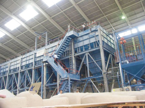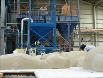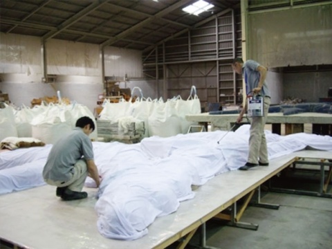 ▶成型機で押し出された土ブロックに対し底面、側面の粗取り。側面(高さ方向はひとまわり大きく粗取りする。その後、図面を1.1倍に拡大し印刷したフィルムの上に土ブロックを敷き並べていく。