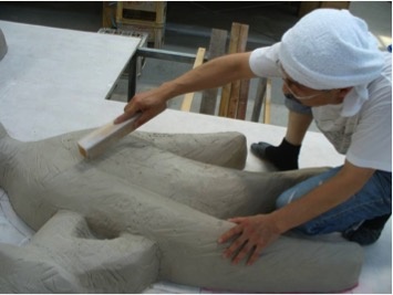 マケットはあくまで習作にすぎない。その観点から、先人たちの作品の前で、新しいレリーフを創り出していく。先人たちの想いを感じ取りながら、敷き並べた土ブロック目がけ手を入れる。初回の彫塑作業は、監修の先生方に5日間滞在していただき、精力的に作業に携わっていただきました。