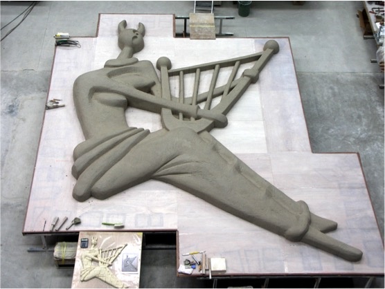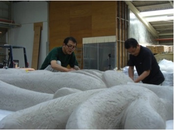 本製作のレリーフは牧神1体当り約6mもの大きさとなります。全体の印象や仕上がり感を人間の視覚でとらえるにはあまりに大きいサイズなのです。それを忠実に、加えて大胆に、設置した時のイメージをも考慮して作りあげていく必要がありました。 建畠先生の言葉を借りれば、それは、新解釈でのレリーフ創出ということになります。