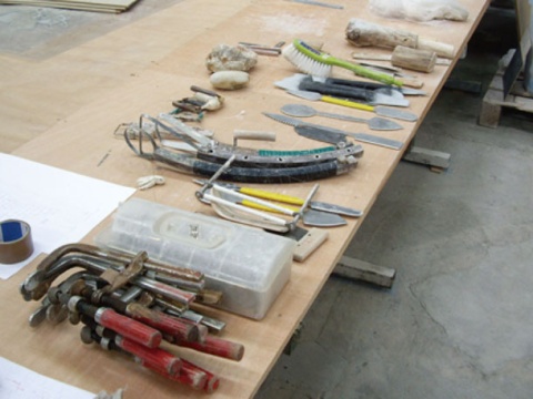 ▶監修の先生方にも自前の道具を持ち込んでいただき、当社で準備した道具と合わせて作業を行った。荒削りするヘラ、包丁、垂木、テクスチュアを入れる石など、様々な道具を使い製作した。