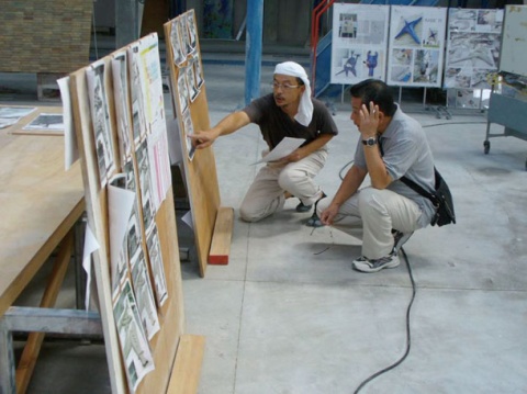 ▶様々な道具を使用し、テクスチュアを入れていく。(写真右:左から、監修者の建畠先生、鷹尾先生)