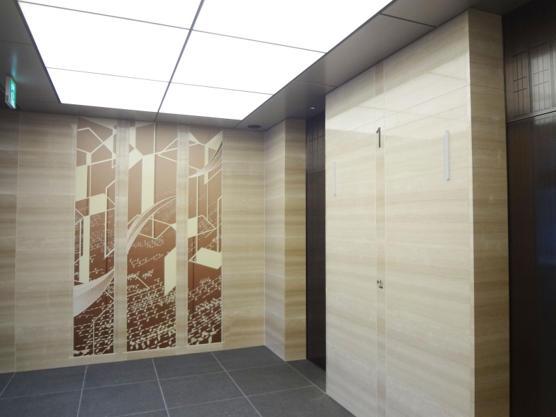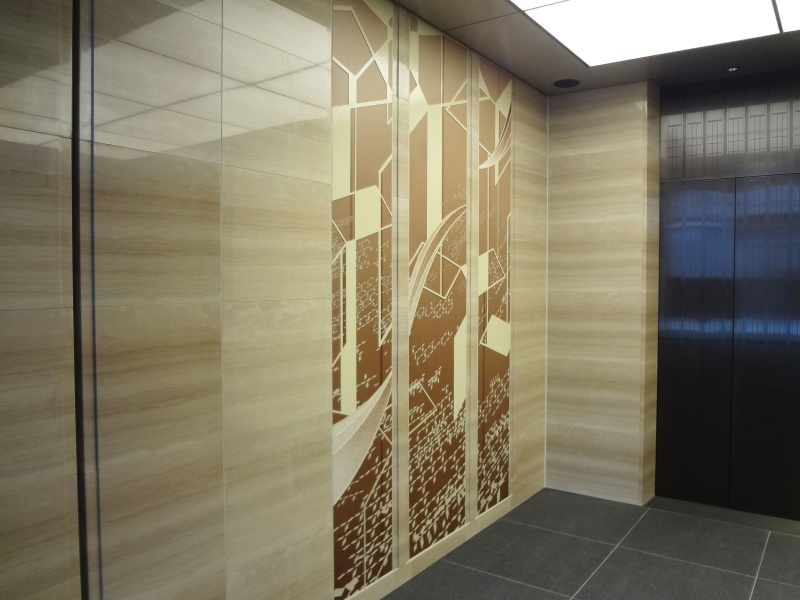 実績紹介 徳島銀行本店ビル 物件名 徳島銀行本店ビル デザイン 大塚オーミオリジナル 作品寸法 H2865×W450㎜ 2本/H2865×w600㎜ 1本 都道府県 徳島県 製品区分 大型陶板 製作年 2015年