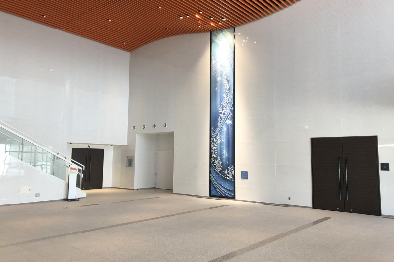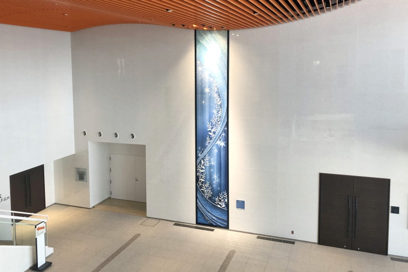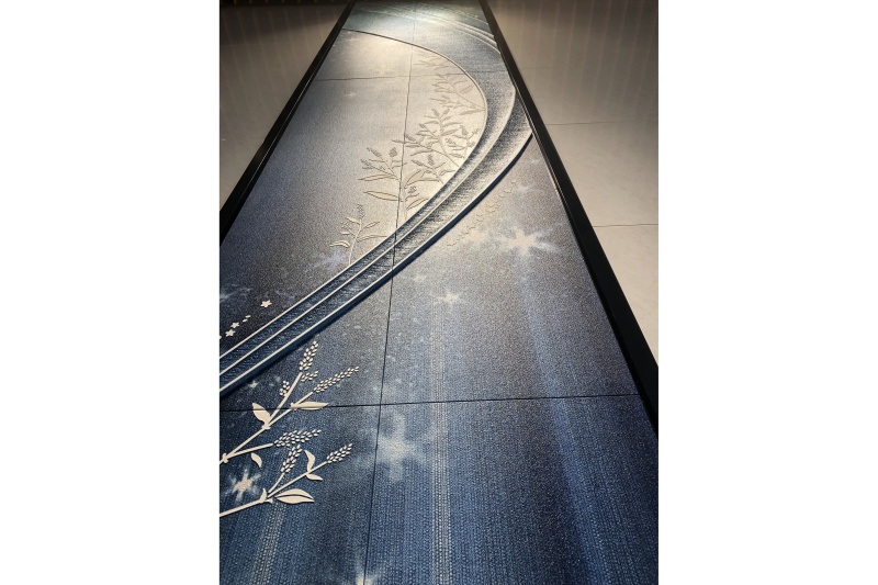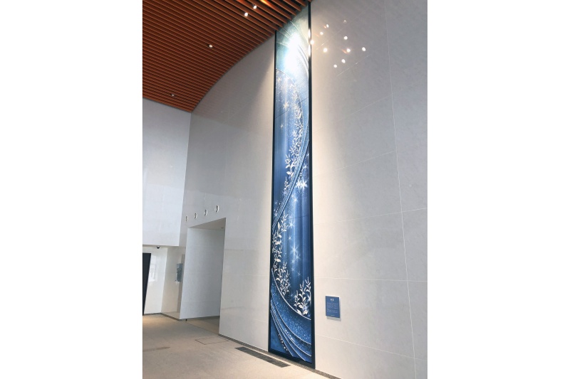 藍が育つ肥沃な土地をもたらした吉野川の清流と輝く水面をモチーフに、人と町が大きく伸びていく姿を描いている。藍の花と五線譜を意図した曲線により、人々が出会い、交流することで奏でられる「音とリズム」、「集約と発展」を表現した。この場所を訪れた皆に、唯一無二の素晴らしい出会いが生まれ、交流が育まれるようにとの願いが込められている。