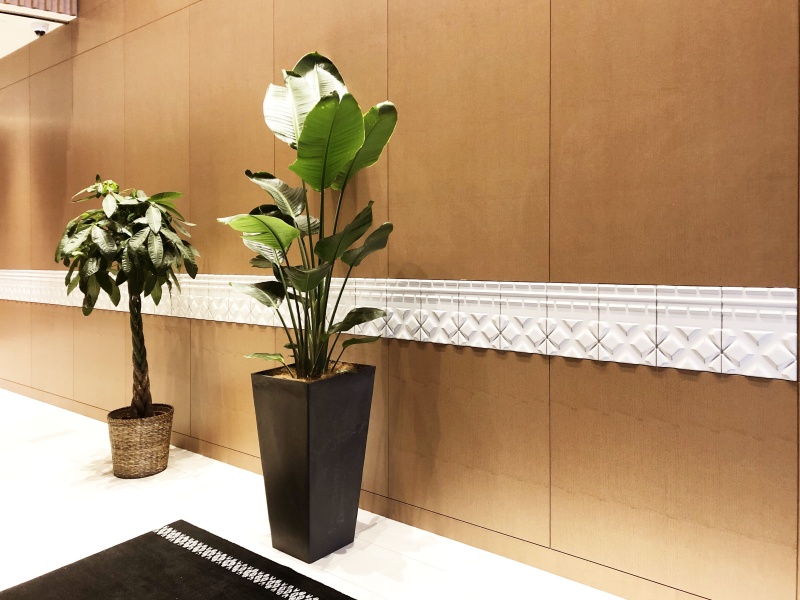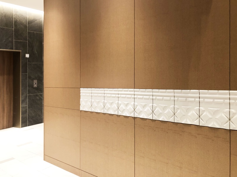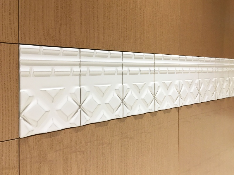 「献上博多織」をモチーフとして、親子縞と華皿を、立体的に表現しています。