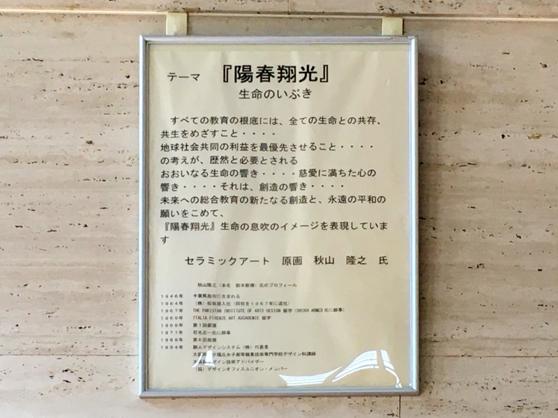 実績紹介 伊丹市立総合教育センター 物件名 伊丹市立総合教育センター 作品名 「陽春翔光」 作家名 秋山隆之 作品寸法 H3000×W4200㎜ 都道府県 兵庫県 製品区分 大型陶板 製作年 1994年