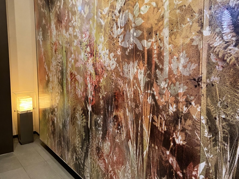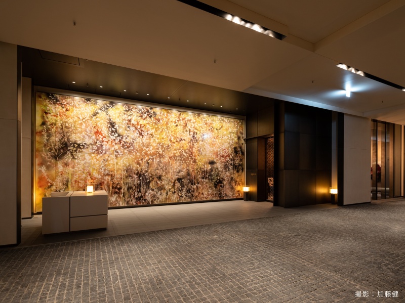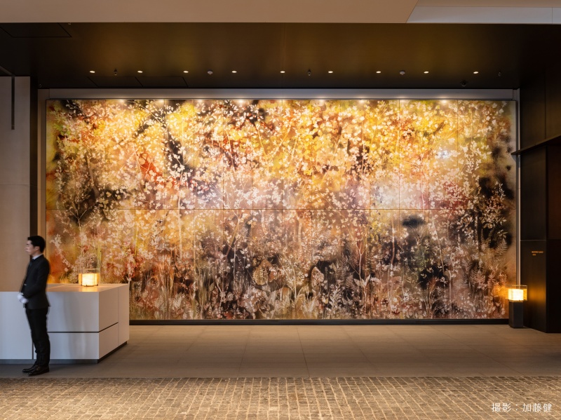 実績紹介 虎ノ門ヒルズ レジデンシャルタワー 物件名 虎ノ門ヒルズ レジデンシャルタワー 作品名 「無題」 作家名 サム・フォールズ 作品寸法 H5000×W9600×t20 mm 都道府県 東京都 製品区分 大型陶板 製作年 2022年