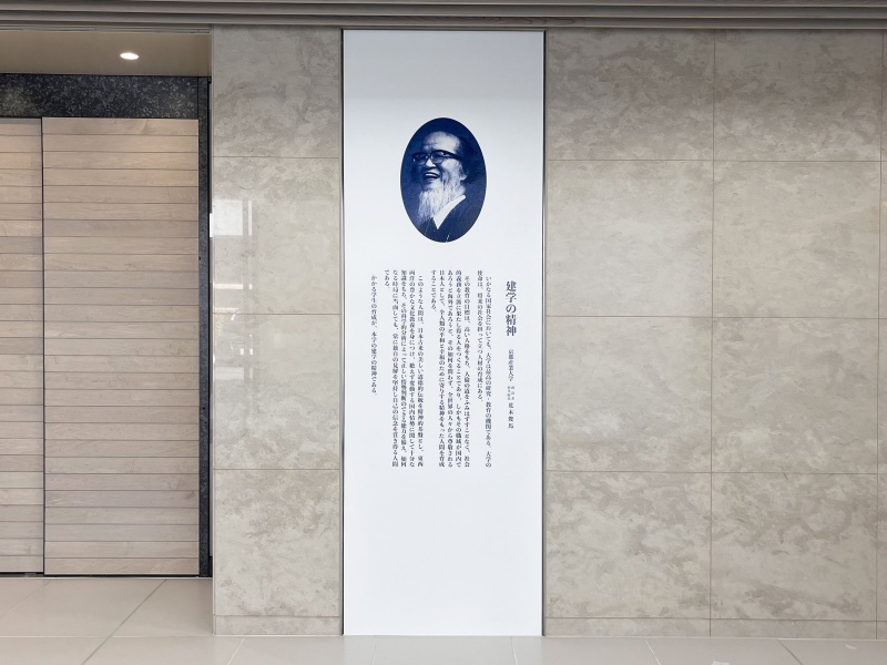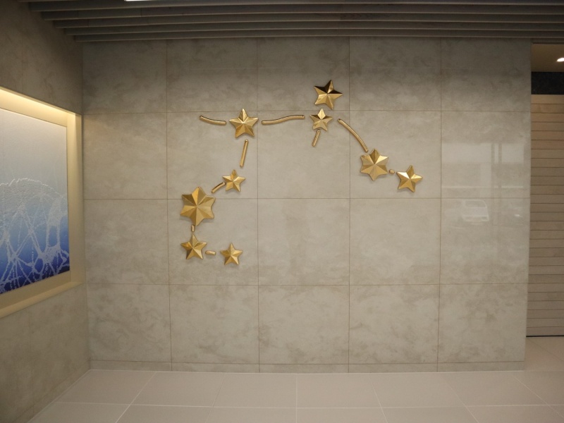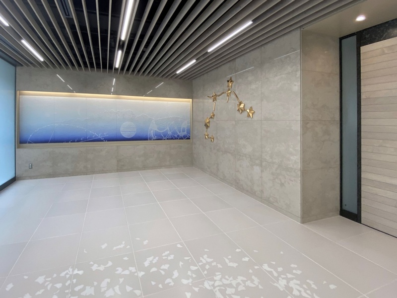 実績紹介 京都産業大学 新本館 物件名 京都産業大学 新本館 デザイン 大塚オーミオリジナル 都道府県 京都府 製作年 2022年 「建学の精神」 H2780×W900㎜ 「神山・学歌」右壁 H1200×W4830㎜ 「本山・宇宙挿絵」左壁 H1200×W4830㎜ 「サギタリウス レリーフ」 約H1500×W2000㎜ 18ピース 「床イチョウデザイン」 約H4800×W11,500㎜ 159枚