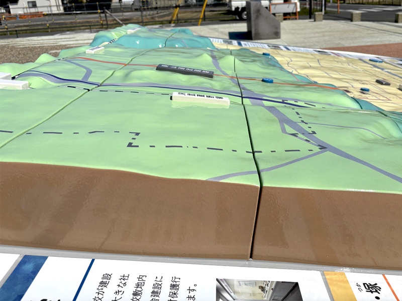 素材には耐久性が高く退色にも強い陶板を採用し、やわらかい雰囲気の色彩や、丸みをもたせた立体的な記号を使い、幅広い世代の方に親しんでいただけるような地形模型です。